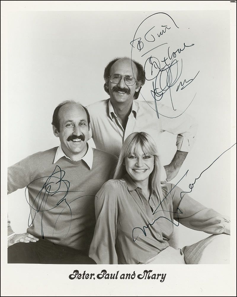 Glossy 8 x 10 publicity photo, signed and inscribed in black felt tip “To Tim, Love, Peter Yarrow,” “Noel Stookey,” and “Mary Travers.” In fine condition.