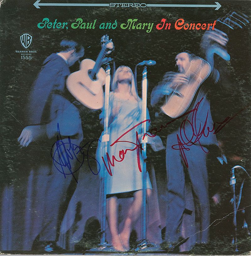 Peter, Paul and Mary in Concert album signed on the front cover in red and blue felt tip by Peter Yarrow, Noel Stookey, and Mary Travers. Scattered creasing and wear to covers and some light contrast to two of the signatures, otherwise fine condition. The record is not included.