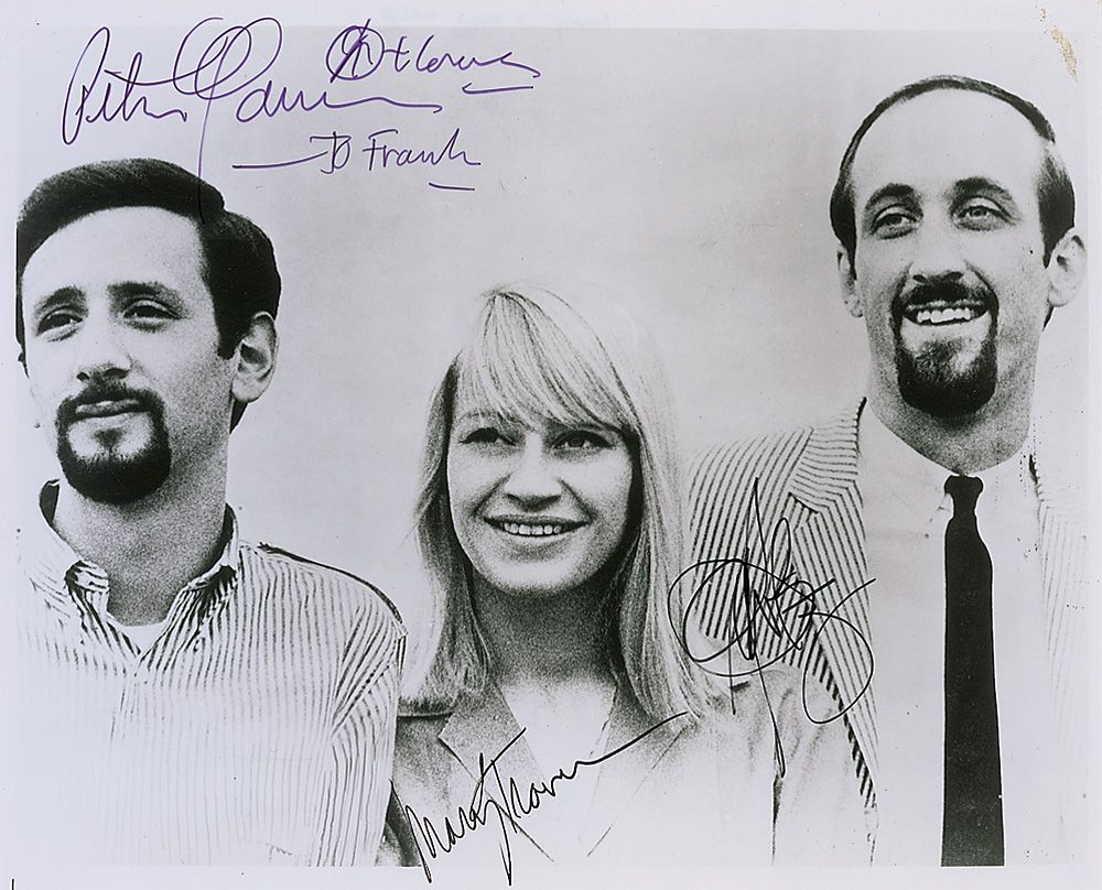 Vintage glossy 10 x 8 photo, signed and inscribed in purple felt tip “Peter Yarrow—To Frank,” adding a peace sign and “love” and signed in black felt tip by Mary Travers and Noel Stookey. In fine condition, with a bit of light soiling to top right corner.