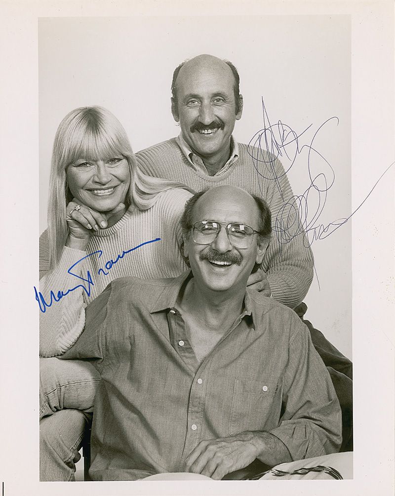 Glossy 8 x 10 photo, signed in black ballpoint by Peter Yarrow and Noel Stookey, and blue felt tip by Mary Travers. In fine condition, with a light crease to the upper border.