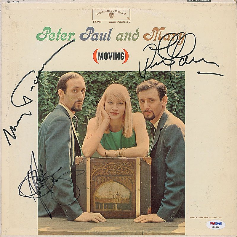 Moving album signed on the front cover in black felt tip by Mary Travers, Peter Yarrow, and Noel Stookey. In fine condition, with scattered light cover wear and a PSA/DNA authentication label affixed to lower right corner. The record is included. Accompanied by a certificate of authenticity from PSA/DNA.