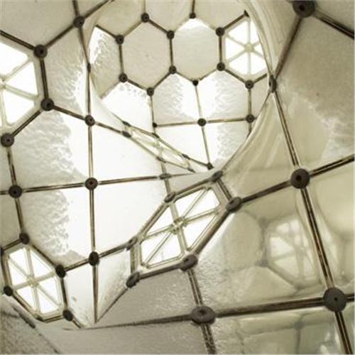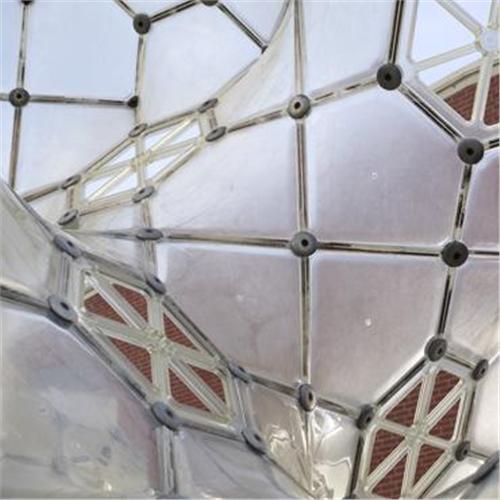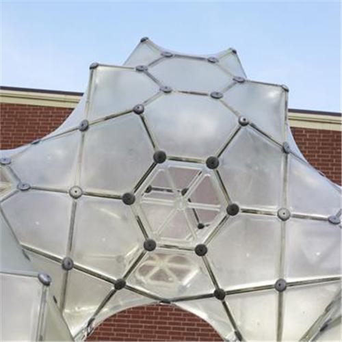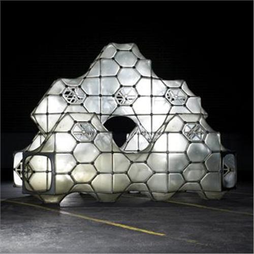 Peter Pearce<BR>Curved Space System<BR>USA, c. 1980<BR>Lexan polycarbonate plastic, aluminum<BR>160 w x 128 d x 120 h inches<BR>Pearces design approach is grounded in a rigorous conceptual understanding of mans relationship with built environments. In his studies as a Graham Foundation fellow from 1965-1966 and printed in his now-influential book <i>Structure in Nature is a Strategy for Design</i>, Pearce articulates a plan for successful constructed environments. Two somewhat opposing notions are required: flexibility and adaptation, and conservation and economy.<BR>For Pearce, the answer is a <i>minimum inventory/maximum diversity</i> system. As he elaborates, "By such a 'system' I mean a <i>minimized</i> inventory of component types (a kit of parts) <i>along with</i> rubrics whereby the components may be combined. In the best systems the rubrics lead not to constriction, but to a <i>maximum</i> of different, though generically related, structural forms." When successful, these modular systems--coined Min-a-Max by Pearce--are efficient in their utilization of standardized elements with limitless possibilities.
