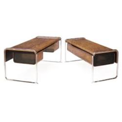 Peter Protzman desk and credenza, by Herman Miller, c.1970, exotically grained molded plywood tops, desk with center drawer and two large drawers on chromed steel base, credenza with three drawers, plastic side panels to drawers, both signed, desk: 65”w x 32”d x 30”h, credenza: 65”w x 26”d x 27”h, very good condition