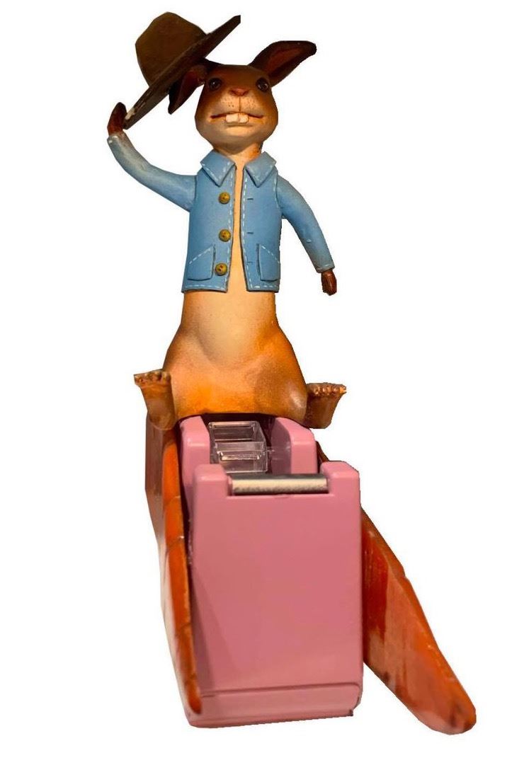 Production maquette used during the making of the hit film Peter Rabbit 2: The Runaway. Thomas and Bea are now married and living with Peter and his rabbit family. Bored of life in the garden, Peter goes to the big city, where he meets shady characters and ends up creating chaos for the whole family. This piece was created early on in the production process and used to create the character and study how they would look on film. This piece renatures the likeness of a small rabbit with a hat sitting on top of a tape dispenser. This piece remains in excellent, production used condition.