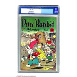 Peter Rabbit Comics #1 (Avon, 1947) CGC NM- 9.2 Off-white to white pages. Avon didn't always mean a sexy, tantalizing cover, unless bunnies turn you on. This gay title managed a run of 34 issues over nine years. Who woulda thunk it? This pretty copy might not have a peer; it's the only one of the premiere issue that CGC has graded to date. Overstreet 2002 NM 9.4 value = $330. Important notice: We expect to be auctioning lots at the rate of 200-250 per hour. Sometimes eBay Premier live bid software cannot keep up with that pace, so we strongly recommend that you place a realistic proxy bid now as insurance to avoid disappointment. Also please note that all Heritage/CAA lots purchased through eBay Premier carry a 20% Buyer's Premium. Please make sure you read the Terms and Conditions.