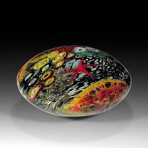 Peter Raos 2001 "Star of the Sea" large millefiori paperweight, with a red starfish, anemones, and coral on a gray, black, and white ocean floor. Signed/dated. Diameter 4".