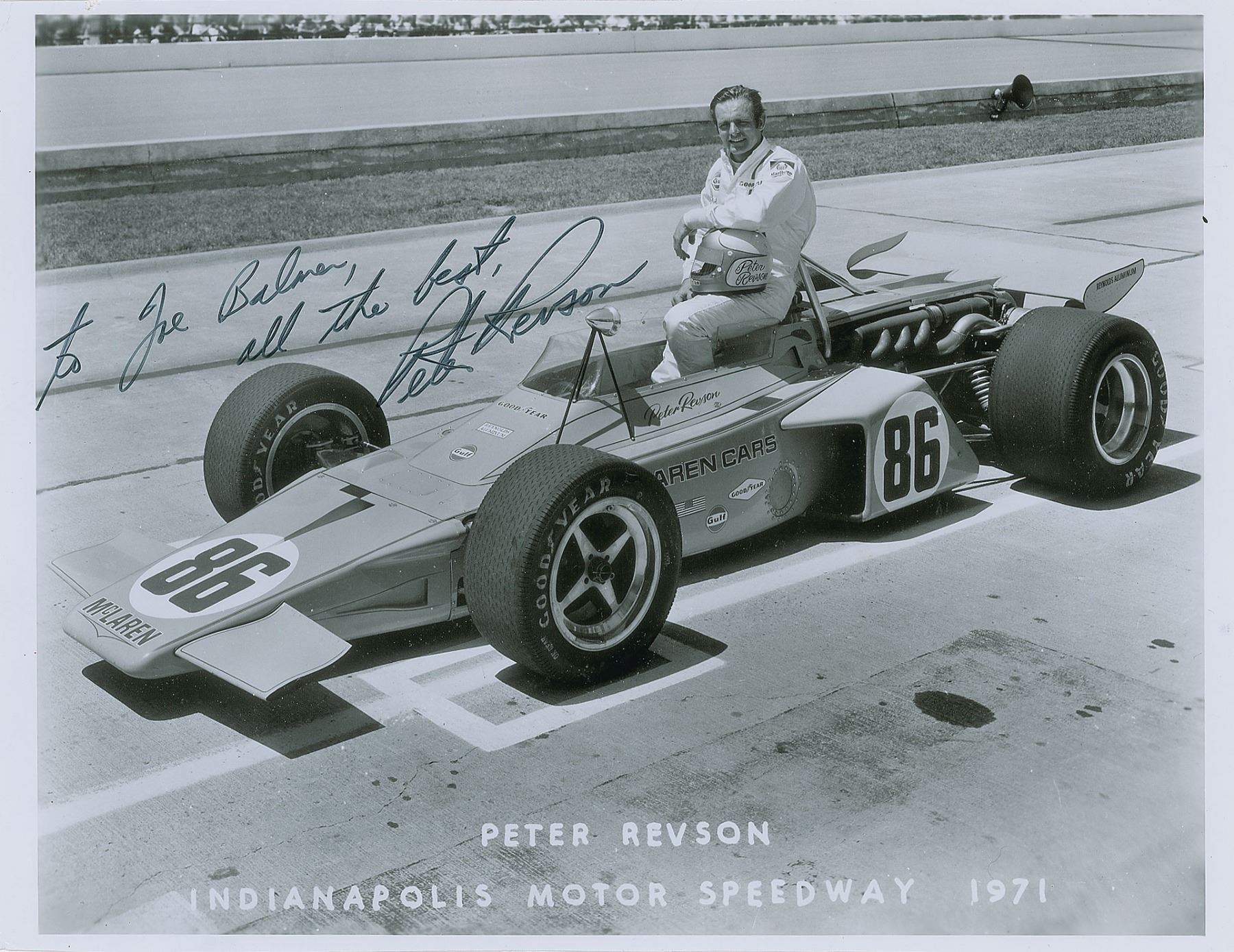 Glossy 10 x 7.75 photo of Revson posing on his McLaren racing car at the Indianapolis Motor Speedway in 1971, signed and inscribed in black felt tip, "To Joe Balmer, all the best, Peter Revson.” In very good to fine condition, with trimmed edges, and scattered light creases and surface impressions.
