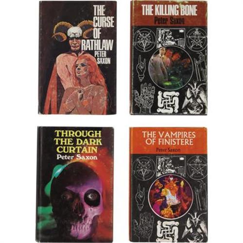 <B>Peter Saxon. Four UK First Editions</B></I>, including: <B><I>Through the Dark Curtain</B></I></B></I>; <B><I>The Curse of Rathlaw</B></I></B></I>; <B><I>The Killing Bone</B></I></B></I>; <B><I>The Vampires of Finistere</B></I></B></I>. London: Howard Baker [1968-1970]. <BR>First UK hardcover editions. Four twelvemo volumes. <BR><BR>Blue cloth with gilt spine titles, except <I>The Curse of Rathlaw</B></I>, which is red cloth with gilt spine titles. Dust jackets. Overall near fine to fine with some wear on dust jackets. <I>From the Robert and Diane Yaspan Collection.</B></I><BR><BR><b>Shipping:</b> Books & Catalogs (<a target="_blank" href="http://www.heritageauctions.com/common/shipping.php">view shipping information</a>)