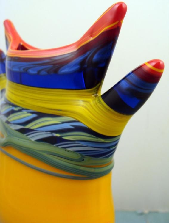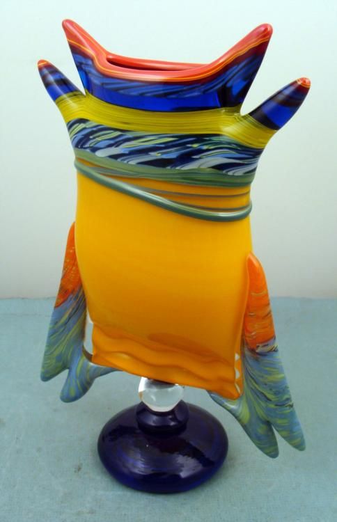 This art glass vase has a pillow shape that has been expanded into something unusual. It has triangular forms jutting out the corners, with bright yellow orange at the center, swirled blues and greens, and red rim. Artist: Peter Secrest Title: Pillow form vaseForm: Hand blown glass sculptureDetails: Orange, yellow, green, blue, with cross sections of canes canes, fused edges, on clear and cobalt baseDimensions: 10 x 6 1/2 x 2 1/4 inches, on 3 inch diameter baseCondition: ExcellentSigned and dated 2002 by the artist on the underside This is sure to be a stand-out vase in your home. * Peter Secrest creates vases, bowls, and sculptural vessles, all with this signature bright colors. His art glass can be found in fine galleries across the country. *