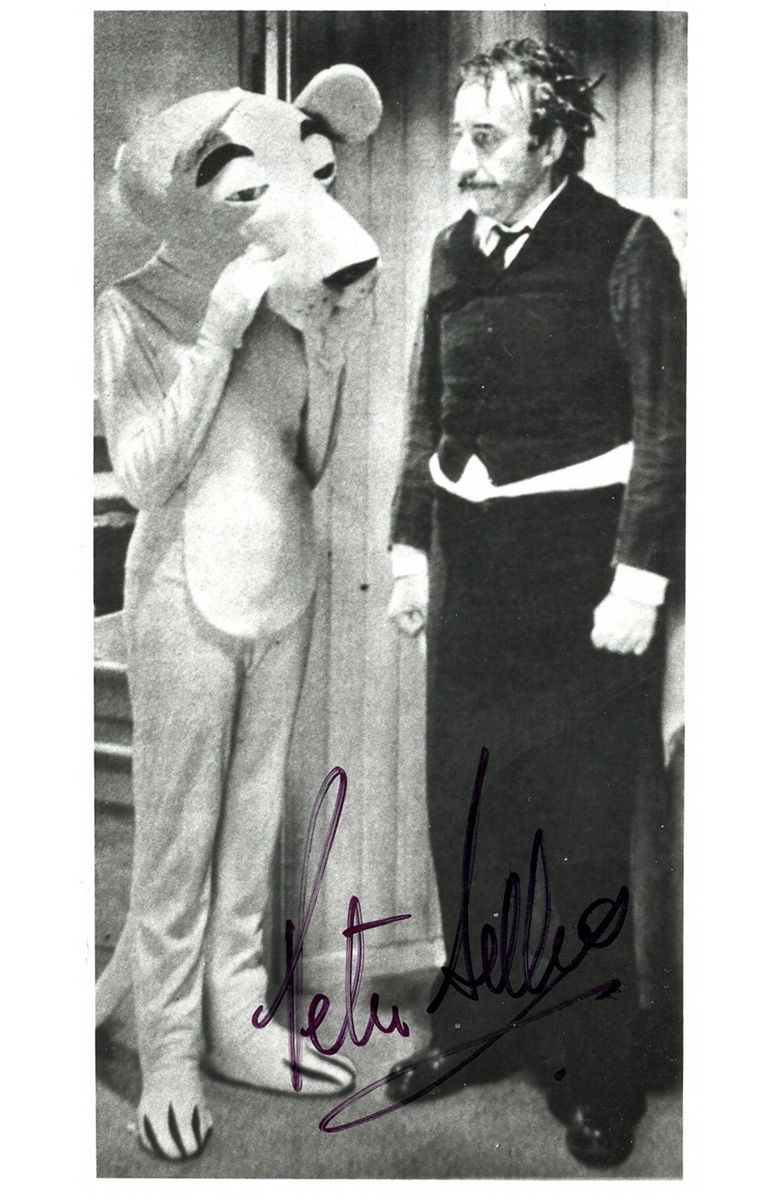 Peter Sellers, CBE (born Richard Henry Sellers; 8 September 1925 – 24 July 1980),Black and white signed photo in black ink, standing next to a costumed Pink Panther. Sellers became known to a world-wide audience through his many film characterizations, among them Chief Inspector Clouseau in The Pink Panther series of films.