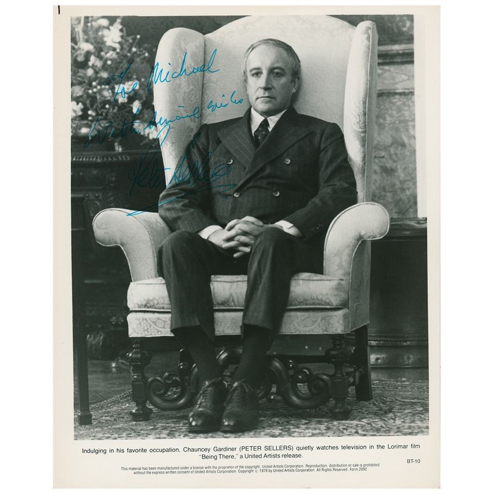 Glossy 8 x 10 United Artists publicity photo of Peter Sellers as in his Oscar-nominated role as Chance the gardener in the 1979 film Being There, signed and inscribed in blue ink, "For Michael, With sincere wishes, Peter Sellers." In fine condition.