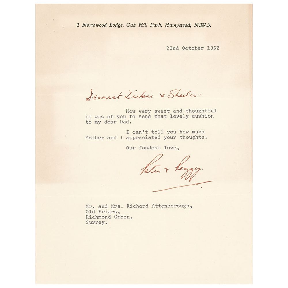 TLS signed “Peter & Peggy,†[on behalf of his mother], one page, 7 x 9, October 23, 1962. Letter to actor and filmmaker Richard Attenborough and his wife Sheila, in full: "How very sweet and thoughtful it was of you to send that lovely cushion to my dear Dad. I can't tell you how much Mother and I appreciated your thoughts." Sellers adds the salutation in his own hand, "Dearest Dickie & Sheila." In fine condition, with somewhat irregular faint toning.