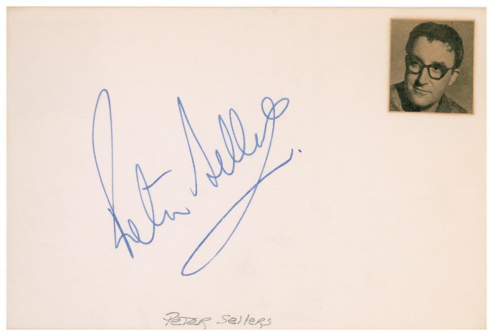 Versatile British comic actor (1925–1980) best known for his memorable performances in such classics as Dr. Strangelove, Being There, and the Pink Panther film series. Ink signature, “Peter Sellers,” on an off-white 6 x 4 card, with a clipped photo affixed to top right corner and a pencil notation along bottom edge. In fine condition, with a bit of mild edge toning. Accompanied by an unsigned glossy photo from The Pink Panther.