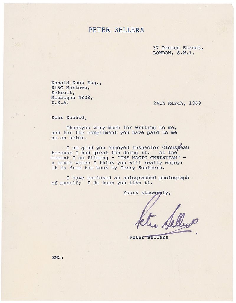 TLS, one page, 8 x 10, personal letterhead on onionskin paper, March 24, 1969. Sellers writes to Donald Koos, in full: “Thank you very much for writing to me, and for the compliment you have paid to me as an actor. I am glad you enjoyed Inspector Clouseau because I had great fun doing it. At the moment I am filming—’The Magic Christian’—a movie which I think you will really enjoy: it is from the book by Terry Southern. I have enclosed an autographed photograph of myself; I do hope you like it.” In fine condition, with intersecting folds, one very lightly passing through the first letter of the last name, a light diagonal crease running from the top left corner to the bottom edge, not affecting the signature, and a horizontal mailing fold passing through the top of the “P” in the signature.