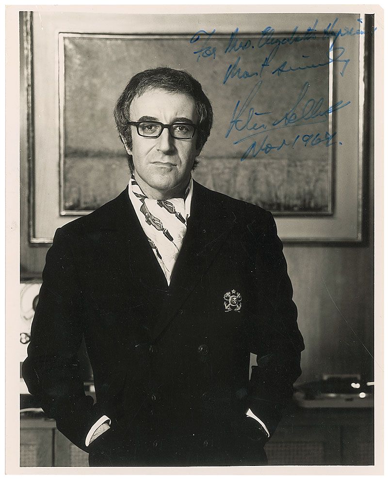 Pearl-finish 8 x 10 photo, signed and inscribed in blue felt tip, “For Miss Elizabeth Haprien, Most sincerely, Peter Sellers, Nov. 1967.” In fine condition, with paperclip impressions to top left and some mild rippling to horizontal edges.