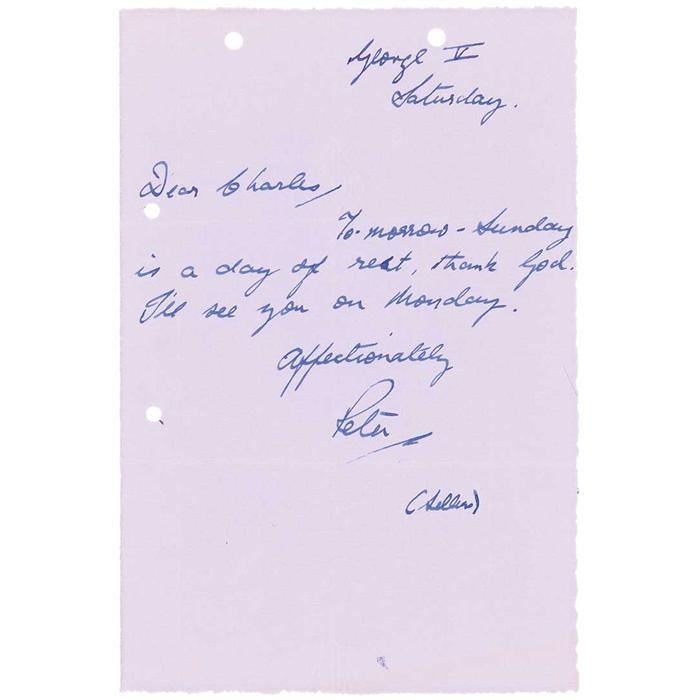 ALS signed “Peter (Sellers),” one page, 6.25 x 9.25, no date. Short letter to noted producer and head of Famous Artists Talent Agency Charles K. Feldman regarding the filming schedule of Casino Royale. In full: “Tomorrow—Sunday is a day of rest, thank God. I’ll see you on Monday.” Accompanied by a letter written to Sellers from Feldman, regarding the busy shooting schedule to finish the film. In fine condition, with punch holes to two edges, and some light wrinkles and creases. Pre-certified PSA/DNA and RRAuction COA.