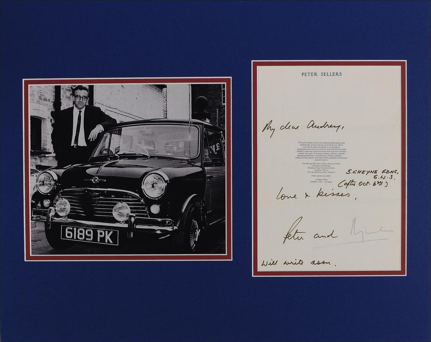 ALS signed “Love & kisses, Peter,” one page, 6.5 x 9.25, personal letterhead, no date. Sellers and his third wife, Miranda Quarry, whom he married in 1970, send thanks via an amusing “form letter.” In part: “We want to thank you for your telegram/letter/card on our wedding day. It was sweet of you to think of us. We’re sorry for the delay in writing to you but due to circumstances beyond our control we were hijacked onto Sam Spiegel’s yacht and suffered severely from exposure to French cuisine. Any gifts in the form of money, old cars, used but laundered underwear, gold false teeth, trinkets, baubles, Danny La Rue, bangles and beads will be gratefully received.” Sellers added a handwritten greeting, his mailing address, and the postscript, “Will write soon.” Matted with a portrait to an overall size of 20 x 16. In fine condition. Pre-certified PSA/DNA and RRAuction COA.