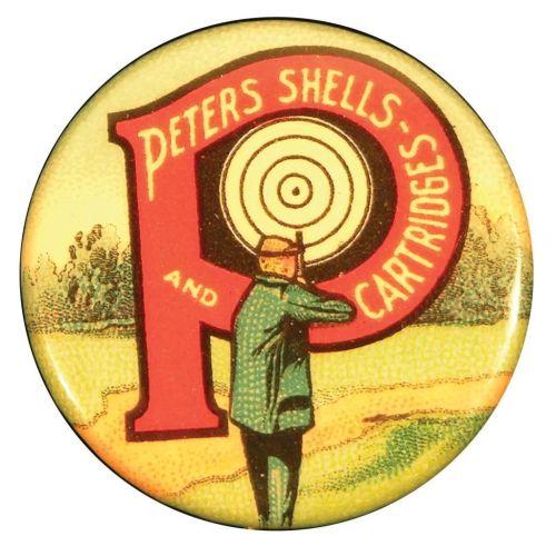 Celluloid Pinback advertising Peters Shells and Cartridges. Excellent condition. 1 inch diameter.