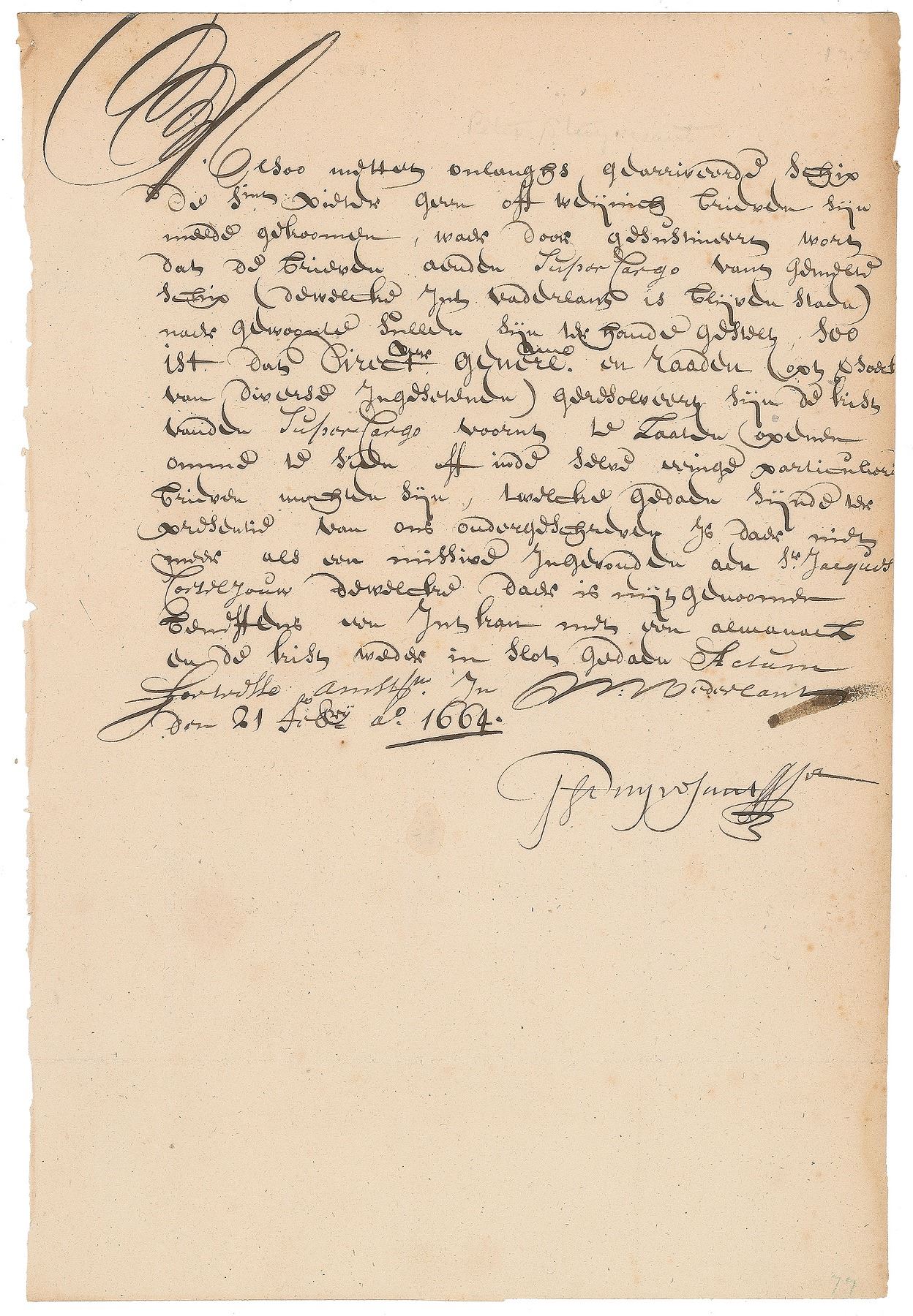 Last Dutch Director-General of the colony of New Netherland (1612–1672) who was a major figure in the early history of New York City. LS in Dutch, signed “P. Stuyvesant,” one page, 7.25 x 10.75, February 21, 1664. Written from Fort Amsterdam, in full (translated): "When few or no letters came with the recently arrived ship Saint Peter, it was said that the letters as usual will have been handed to he Supercargo of this ship (who stayed in the fatherland). Therefore the General Directors and Council members (at the request of various citizens) decided to have the crate of aforementioned Supercargo opened to see if it contained any private letters. This having been done in the presence of the undersigned, nothing was found other than a missive to Mr. Jacques Cortljouw, which was removed, in addition to an ink pot with an almanac, after which the chest was locked again." In fine condition.