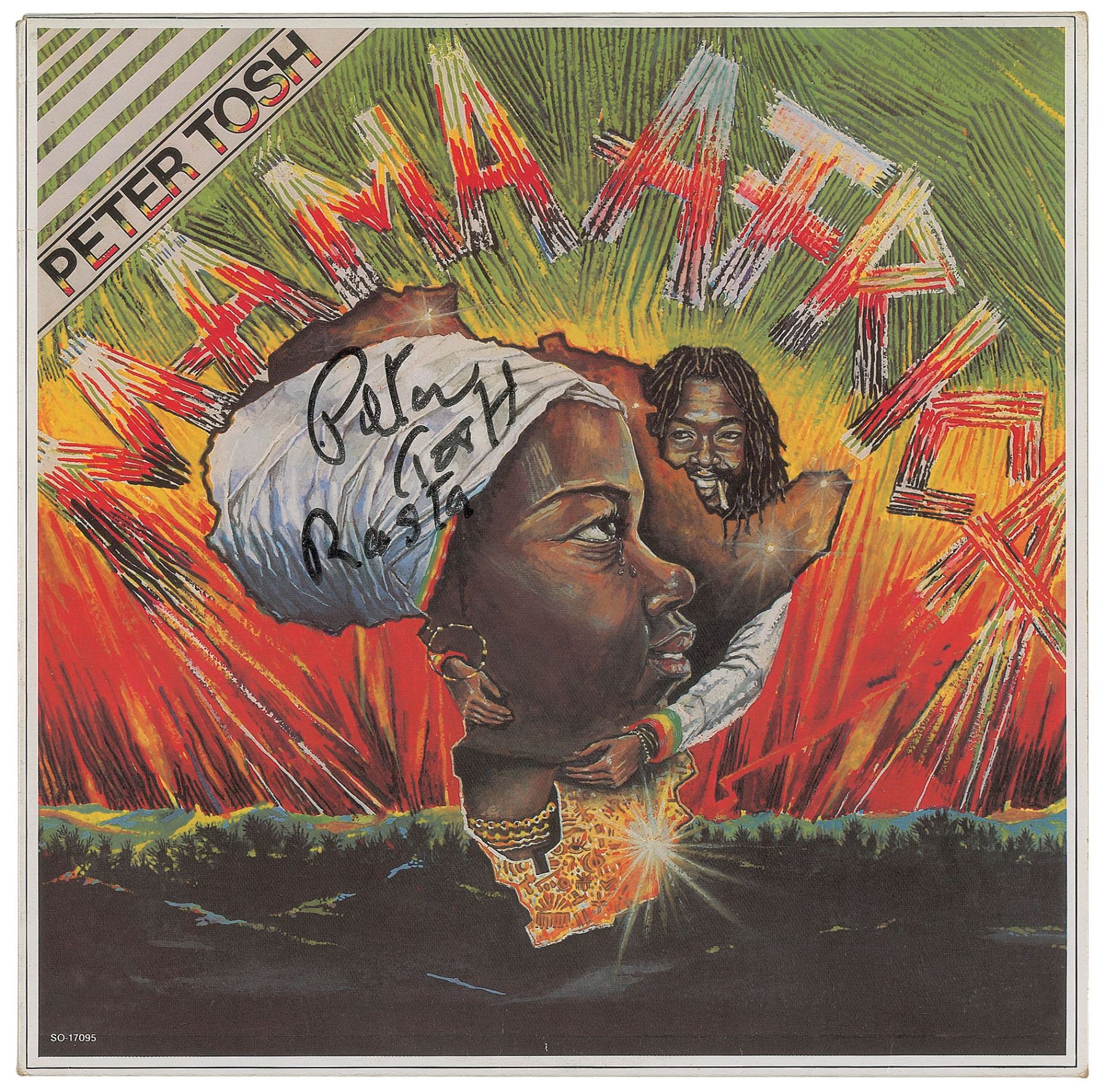 Mama Africa album signed on the front cover in black felt tip, "Peter Tosh, Rasta." In fine condition. The record is included. Accompanied by a full letter of authenticity from REAL, and a newspaper clipping promoting a Tosh album-signing in Mirvish Village, Ontario, on August 5, 1983.