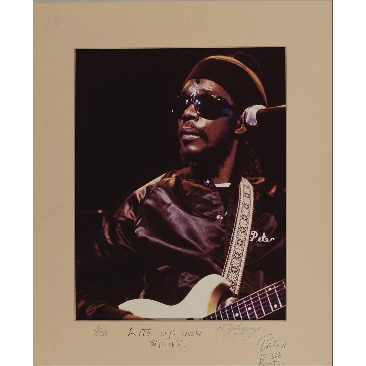 Reggae legend and former Bob Marley & The Wailers band member (1944-1987). After an illustrious career with the Wailers and as a solo musician, he was murdered at his home. Robbery was officially said to be the motivation behind Tosh’s death. Limited edition color 13 x 16 photo of Tosh on stage, #3/250, matted to a size of 15 x 18, signed on the mat in blue ballpoint, “Light up you spliff, Peter Tosh, Rasta.” Also signed in pencil by the photographer. In fine condition. Tosh is rare in any form, let alone in oversized photos.