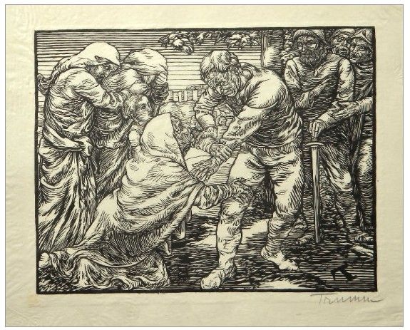 Peter Trumm "Coriolan und seine Mutter" signed original woodcut Coriolanus and his Mother - Medium: original woodcut. Signed in pencil by Peter Trumm and printed in Germany in 1922 for the very rare "Die zweite Ganymed-Mappe" portfolio of "Das vierte Jahrbuch der Marees Gesellschaft", published in Munich by Marees-Gesellschaft, R. Piper & Co. This impression is one of the deluxe signed edition of 300 printed on thin japon paper. The image measures 9 5/8 x 12 1/2 inches (245 x 315 mm) - Professionally Framed & Matted - Comes With Certificate - -