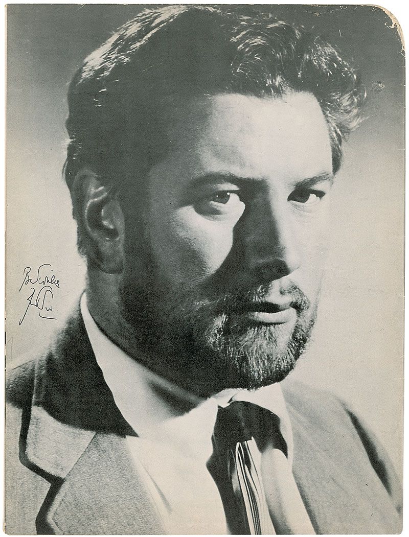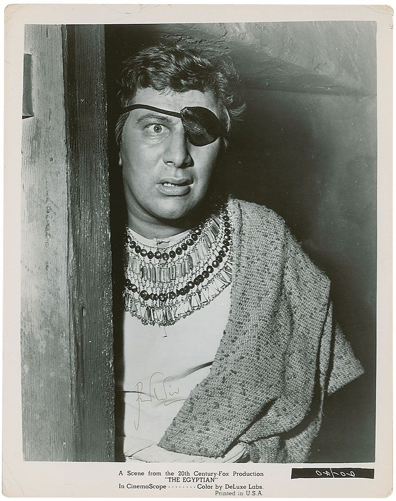Two items: one glossy 8 x 10 20th Century Fox promotional photo for The Egyptian, signed in black felt tip, and a program for a performance of Romeo and Juliet, 9 x 12,signed on his full-page in black ink, “Best wishes, Peter Ustinov.” Creases to the photo’s corner tips and its signature a few shades light, and wear and paper loss to the upper left corner of the program, otherwise fine condition.
