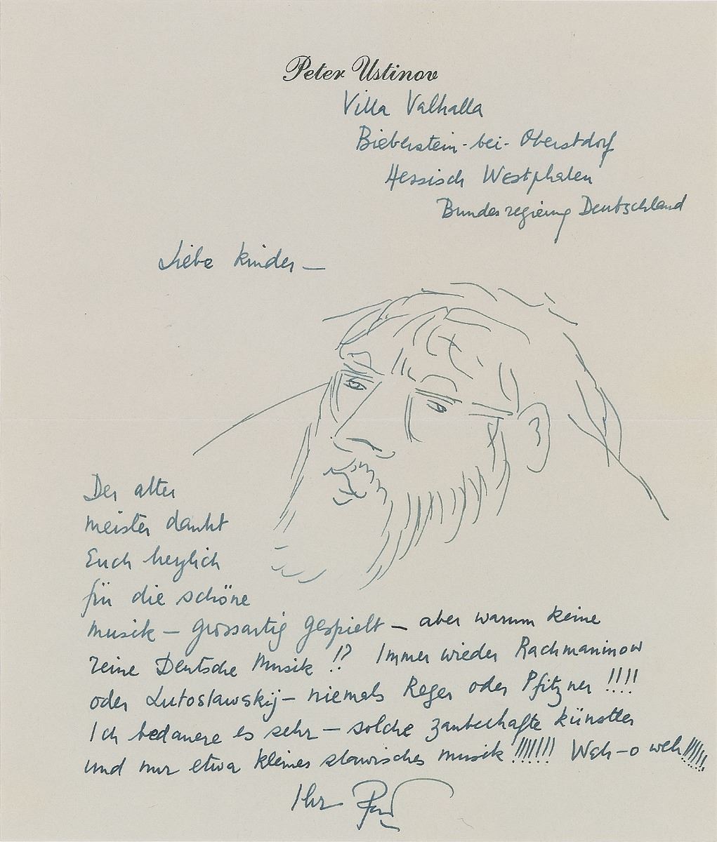 ALS in German, signed “Peter,” one page, 6.25 x 7.5, personal letterhead, no date but postmarked May 1, 1963. Letter to “children,” the esteemed husband-and-wife piano duo of Vronsky and Babin, in full (translated): “The old master cordially thanks you for the beautiful music—masterfully performed, but why no pure German music? Again and again Rachmaninoff or Lutoslawski—never Reger or Pfitzner!!!! I regret it very much, such magic performers and just a little bit of Slavic music!!!!!!! Oh, woe to us all!!!!!!” Ustinov has added a wonderful ink self-portrait sketch to the main body of the letter. In fine condition. Accompanied by the original mailing envelope.