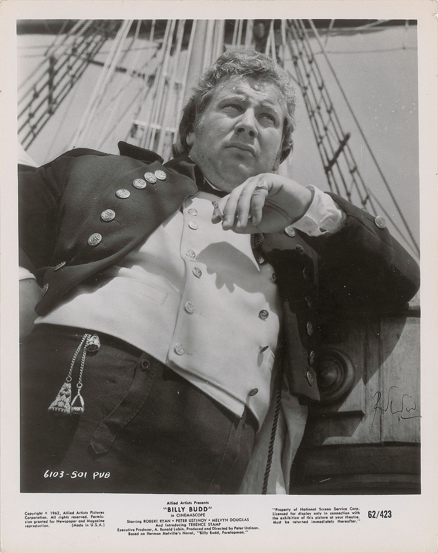 Four glossy 8 x 10 publicity stills from Ustinov's films Billy Budd, Hot Millions, Treasure of Matecumbe, and one other, each signed in black felt tip by the actor. In overall fine condition, with some light scattered creasing, and poor contrast to one of the signatures.