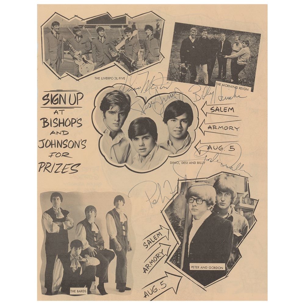 Vintage circa 1968 program page for rock shows at the Salem Armory in Oregon, 9.75 x 11.25, signed next to their images in fountain pen by Peter Asher and Gordon Waller, and above by Dean Paul Martin, Desi Arnaz, Jr., and Billy Hinsche. In fine condition.