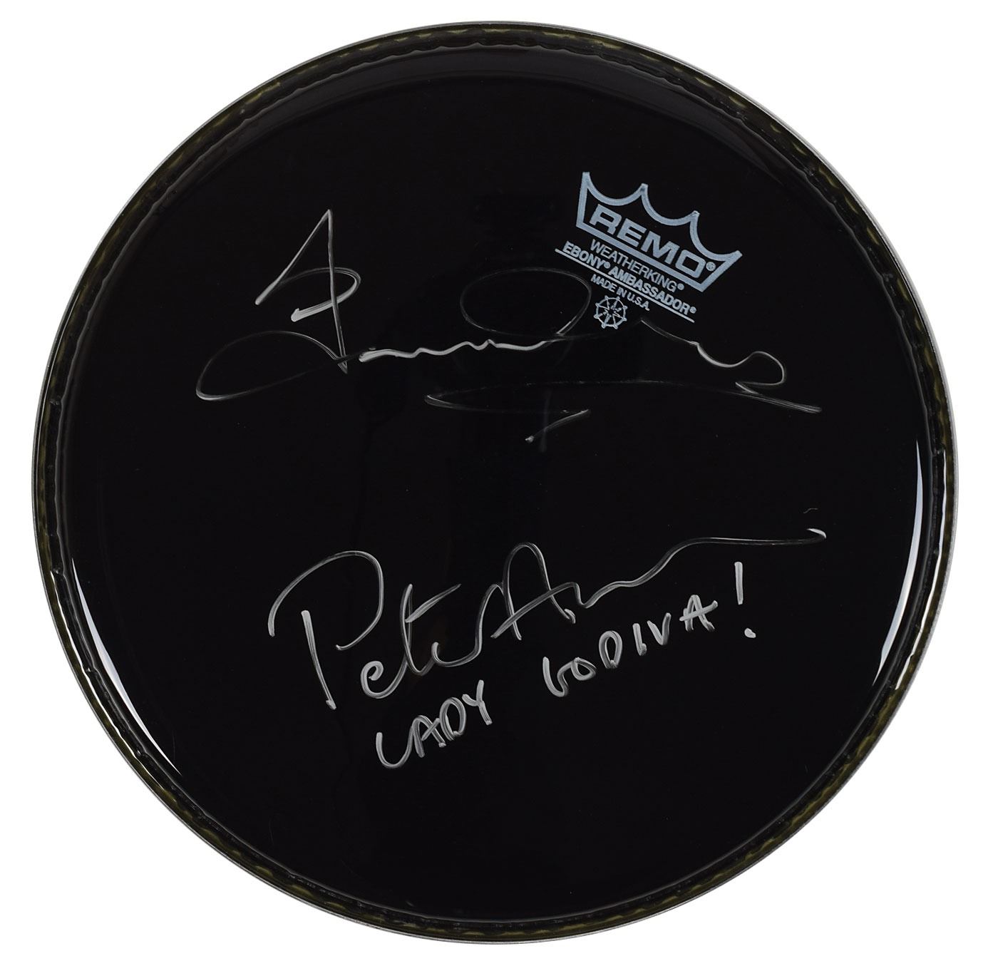 Ebony Remo Weatherking Ambassador drum head, 10? in diameter, signed in silver ink by Gordon Waller and Peter Asher, who adds “Lady Godiva!” In fine condition.