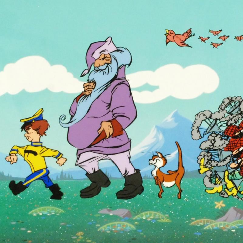 Own this amazing piece based on the original line image hand drawn and hand-inked on paper by Mr. Jones! "Peter and the Wolf" is a limited edition animation cel from a sold out edition with hand-painted color on sericel outline, numbered and hand-signed by Chuck Jones (1912-2002). The sericel comes with a brilliant full-color background. Includes Certificate of Authenticity! Measures approx. 25" x 10.5" (sericel and background).