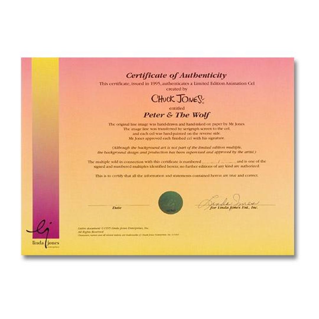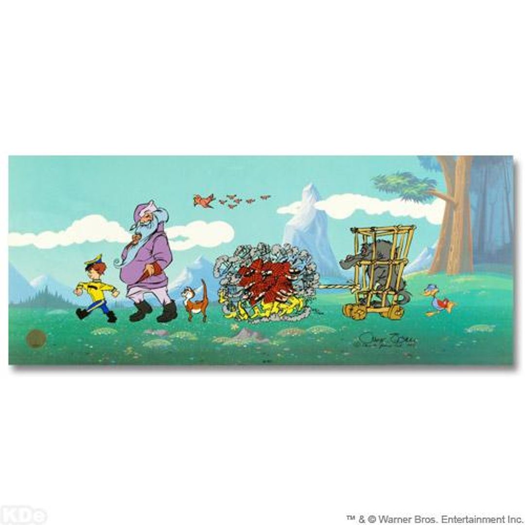 Own this amazing piece based on the original line image hand drawn and hand-inked on paper by Mr. Jones! "Peter and the Wolf" is a limited edition animation cel from a sold out edition with hand-painted color on sericel outline, numbered and hand-signed by Chuck Jones (1912-2002). The sericel comes with a brilliant full-color background. Includes Certificate of Authenticity! Measures approx. 25" x 10.5" (sericel and background).