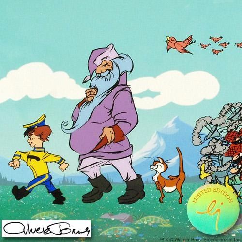Own this amazing piece based on the original line image hand drawn and hand-inked on paper by Mr. Jones! "Peter and the Wolf" is a limited edition animation cel from a sold out edition with hand-painted color on sericel outline, numbered and hand-signed by Chuck Jones (1912-2002). The sericel comes with a brilliant full-color background. Includes Certificate of Authenticity! Measures approx. 25" x 10.5" (sericel and background).
