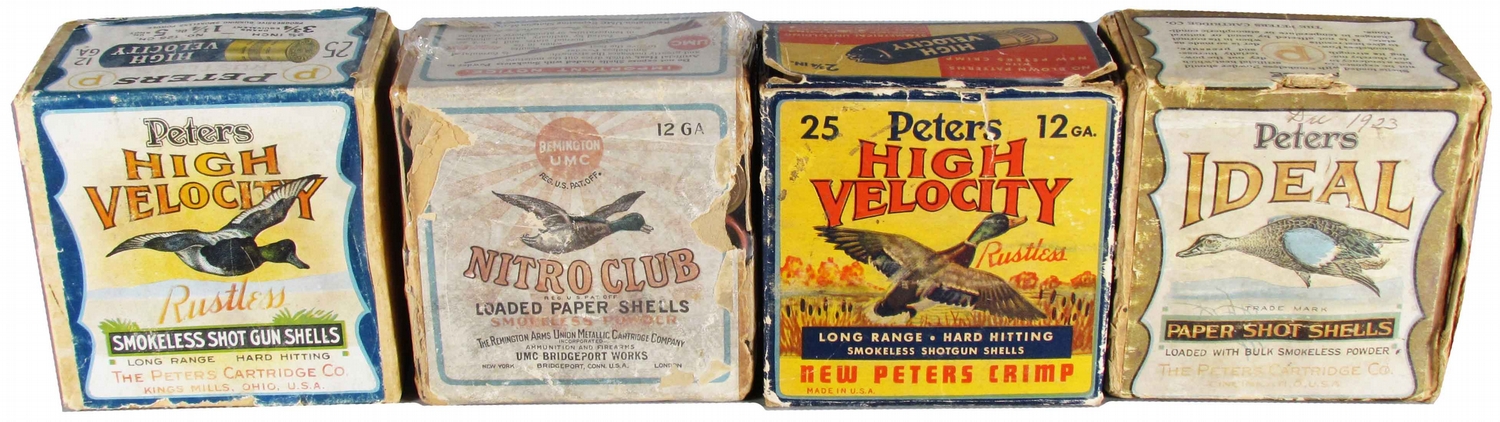 Peter's And Remington Shot Shell Boxes. Peter's High Velocity, Peter's Ideal Paper Shot Shells, New Peter's Crimp (shells in box) and Remington UMC Nitro Club (full box). Various conditions.