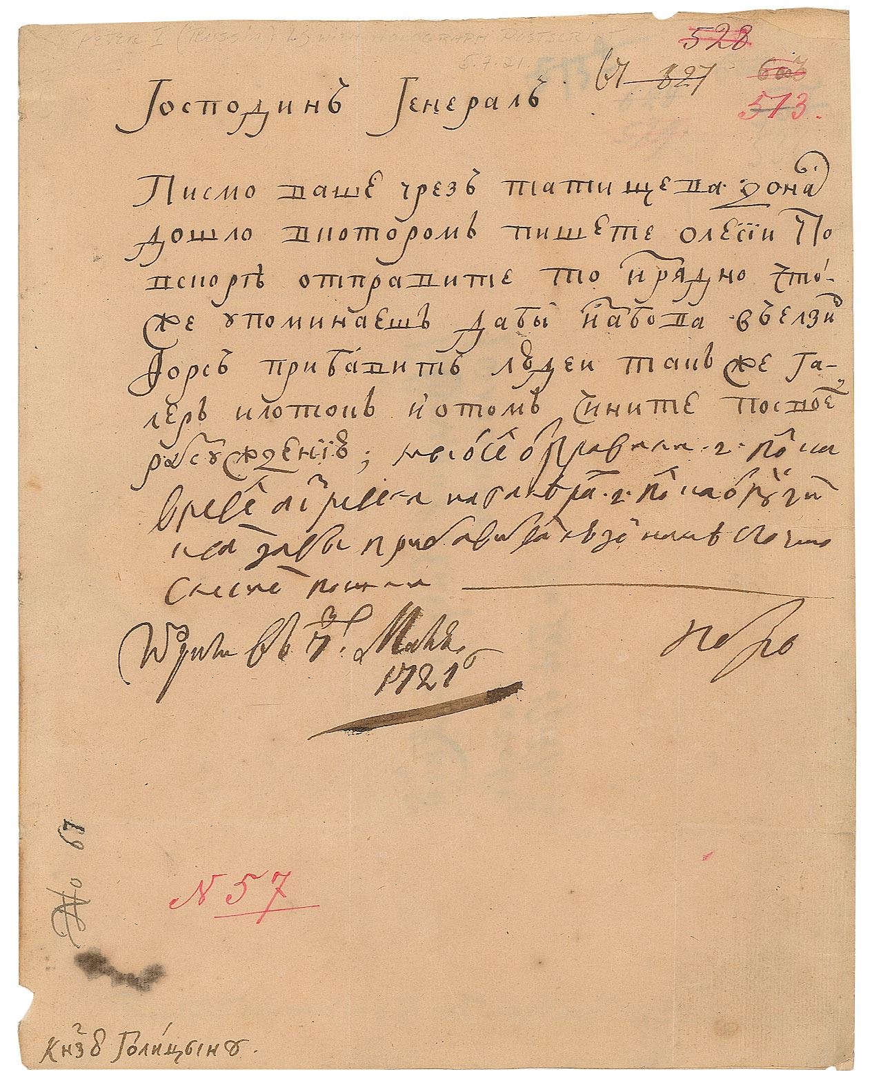 LS in Russian, signed “Piotr,” one page, 7.25 x 9, May 7, 1721. Written in a clear secretarial hand and addressed to General Golitsyn "at Abo or wherever else he may be," this important letter was written towards the end of Russia's 21-year conflict with Sweden, during which Russia had occupied the Swedish territory of Finland. Peter acknowledges the receipt through his aide Aleksey Tatishchev of Goltitsyn's letter about General Lacy in which he stated his intention of increasing the number of men and galleys going from Abo to Helsingfors, and instructs Golitsyn to carry this out according to his judgment. Peter adds a four-line confirmatory postscript in his own barely legible hand. In very good to fine condition, with splitting along the hinge, and repaired seal-related paper loss to the integral address leaf.