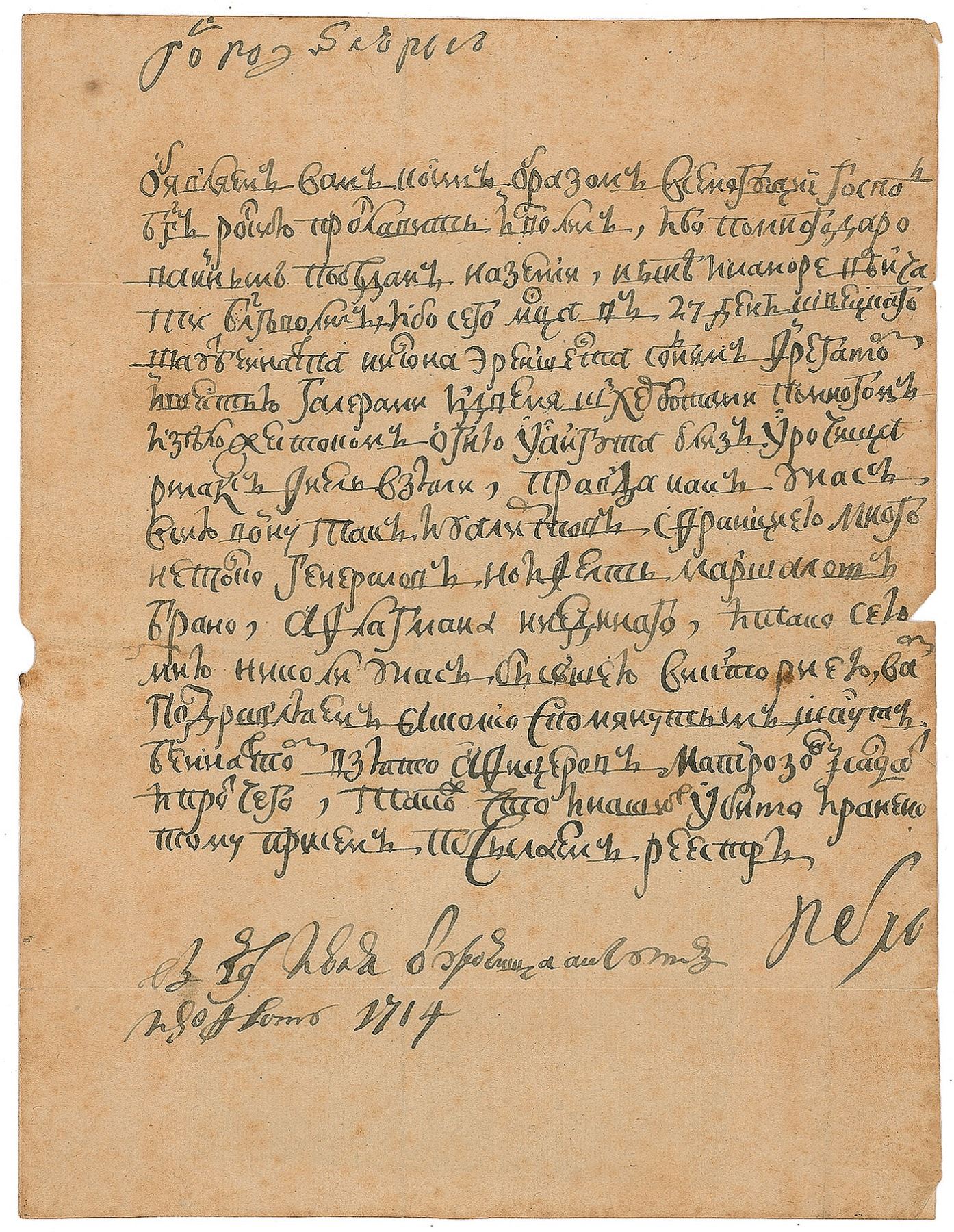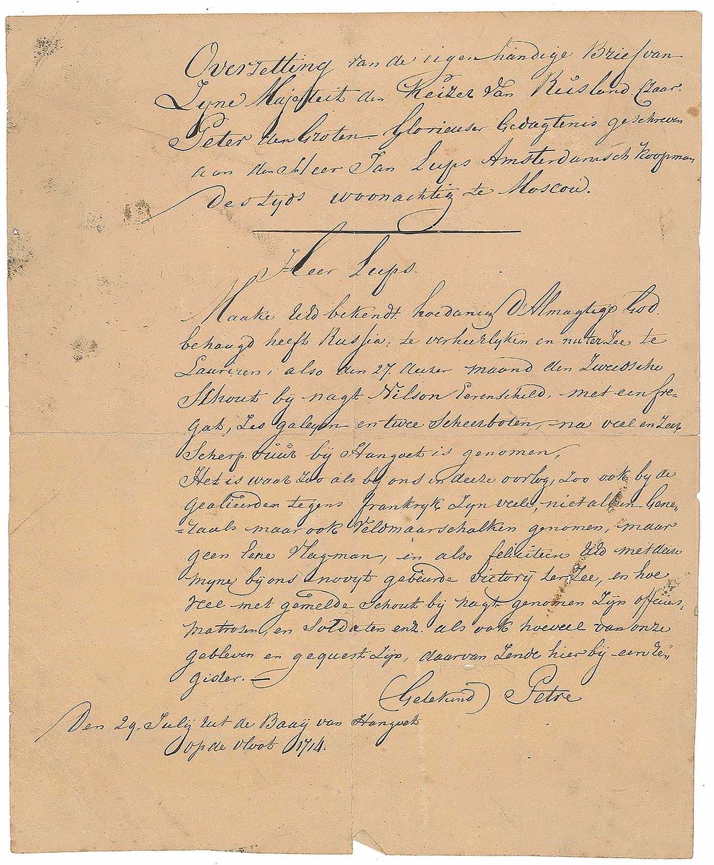 LS in Russian, signed “Piotr,” one page, 6.25 x 8, July 29, 1714. Letter to Jan Lups, in full (translated): "Let Us reveal to you the means by which the Almighty Lord God has seen fit to glorify Russia, for He has deigned to crown her with many victories granted on the land, and now at sea, for, on the 27th day of this month, with much cruel fire, we took Rear Admiral Nilson Ehrenskjold, with one frigate, six galleys, and two skerry boats off Hango, near the prominent land feature, Rilaks Fjord. Truly the whole war for us has been as for the allies with France; a great number not just of generals, but also of field marshals taken, with more than one victory of the kind. We congratulate you; and as with the accounting of officers, sailors, and so forth taken with the Rear Admiral already mentioned, we send our roster of our killed and wounded herein." In very good to fine condition, with light toning and foxing, and two small edge chips.