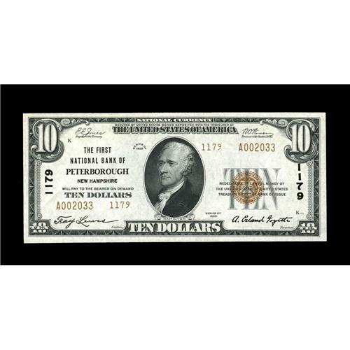 <B>Peterborough, NH</B></I> - $10 1929 Ty. 2 <B>The First NB </B></I> Ch. # 1179<BR>The paper surfaces are clearly of Gem quality and freshness, with the <B>Choice Crisp Uncirculated</B></I> grade assigned solely due to a few subtle handling indications. As nice or nicer than many of the notes one encounters today with the higher grade attached.