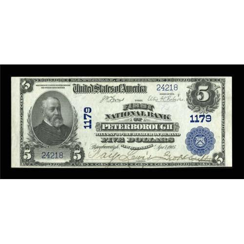 <B>Peterborough, NH</B></I> - $5 1902 Plain Back Fr. 598 <B>The First NB</B></I> Ch. # 1179<BR> One of a small group of high grade Third Charter examples which turned up many years ago. This piece is listed in the census as CU, but we are going to be super conservative here and label it as <B>Choice About Uncirculated.</B></I> Whatever its technical grade, it's a bright, fresh, and vividly colored specimen which is certain to please its new owner.<BR><BR><BR><b>Shipping:</b> Coins & Currency (<a target="_blank" href="http://www.heritageauctions.com/common/shipping.php">view shipping information</a>)