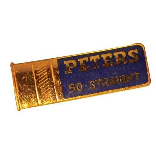 Enameled Brass Pinback advertising Peters 50 Straight. Excellent condition. 1 inch diameter.