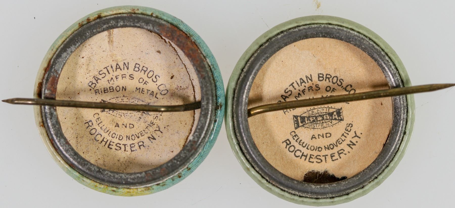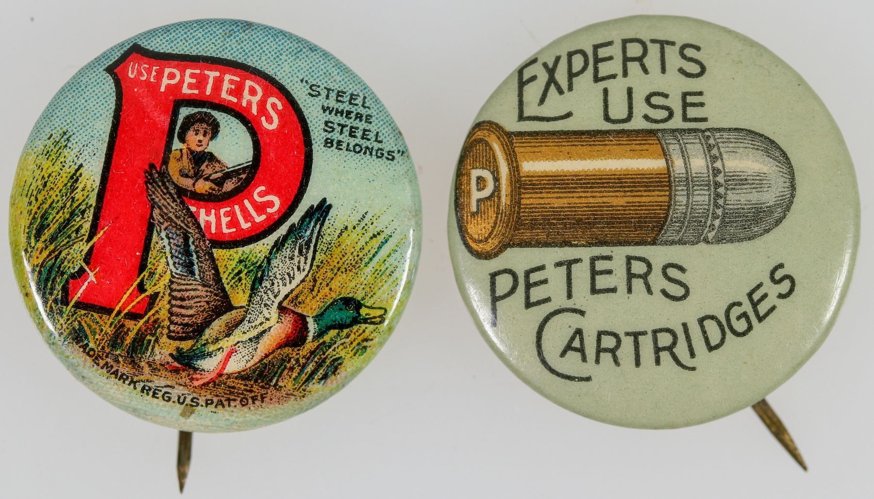 These are two 1 in. pinbacks for Peters ammunition. One pin back depicts a young hunter with a Mallard duck in flight. The second pin back depicts a .22 cartridge. Both are in excellent condition. Made by Bastion Bros. of Rochester, New York. C.1930-1940's. Please see photos for details.