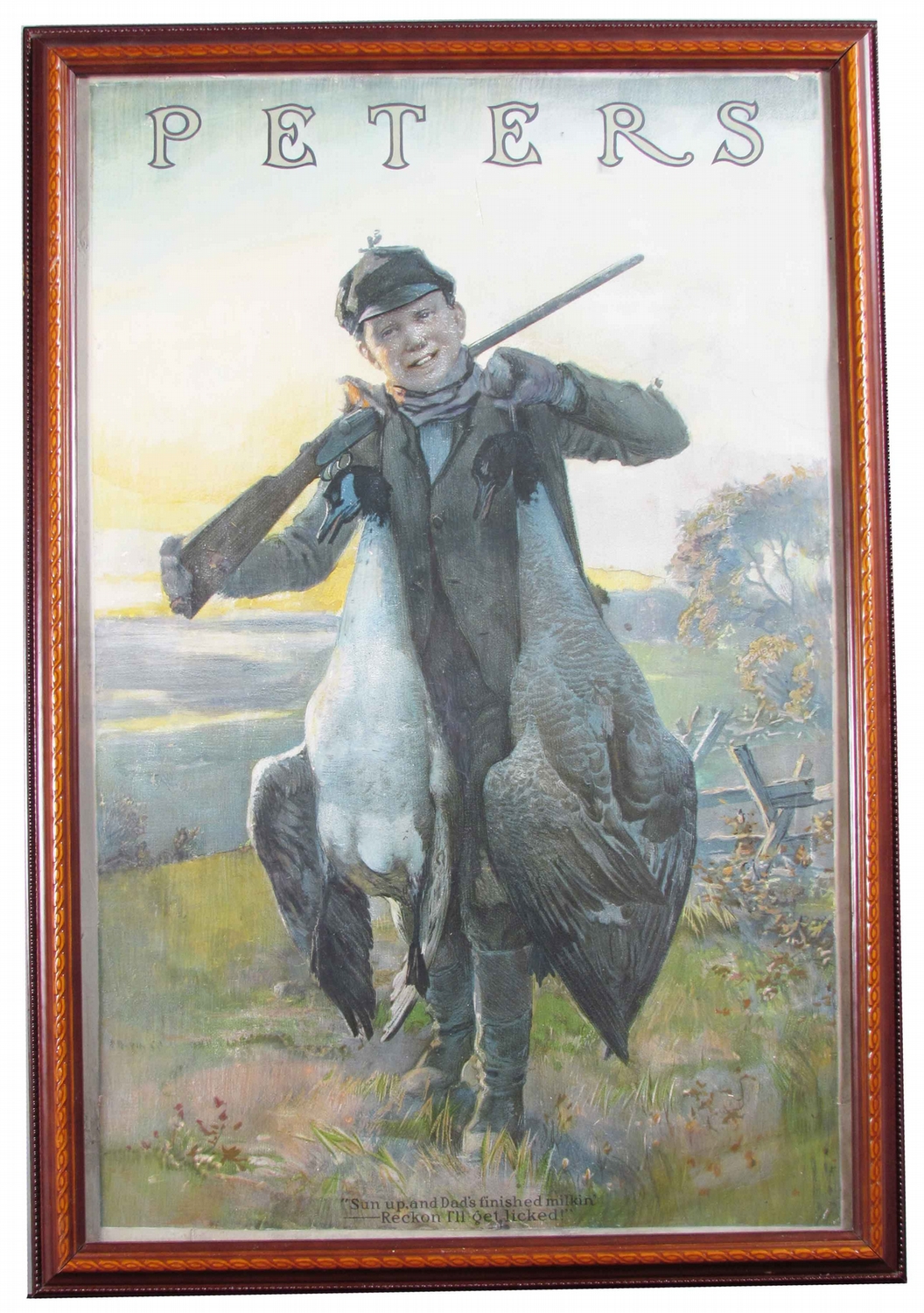 Peters Cartridge Co. Paper Poster. "Reckon I'll get Licked" depicting boy coming back with his hunting prize. A couple of wrinkles and rubs otherwise good condition. 14 X 21 inches.