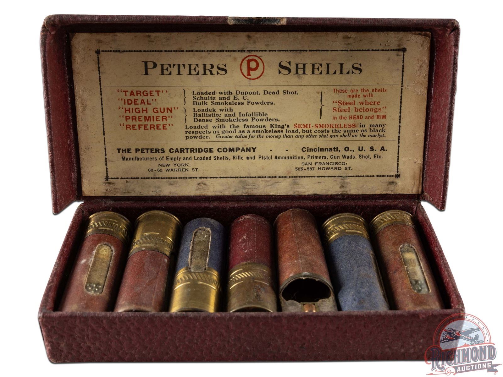 Peters Cartridge Company of Cincinnati, Ohio shotgun shell dummy sample kit with "Target, Ideal, High Gun, Premier, League and Referee" Window shells in hinged purple scale carboard box with "P" in circle on lid.