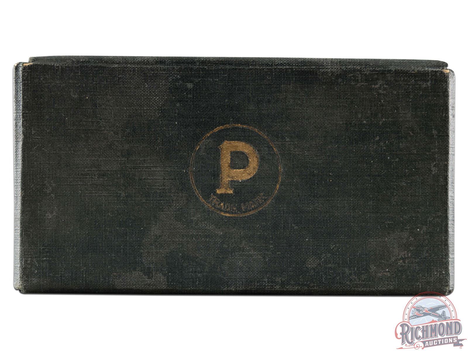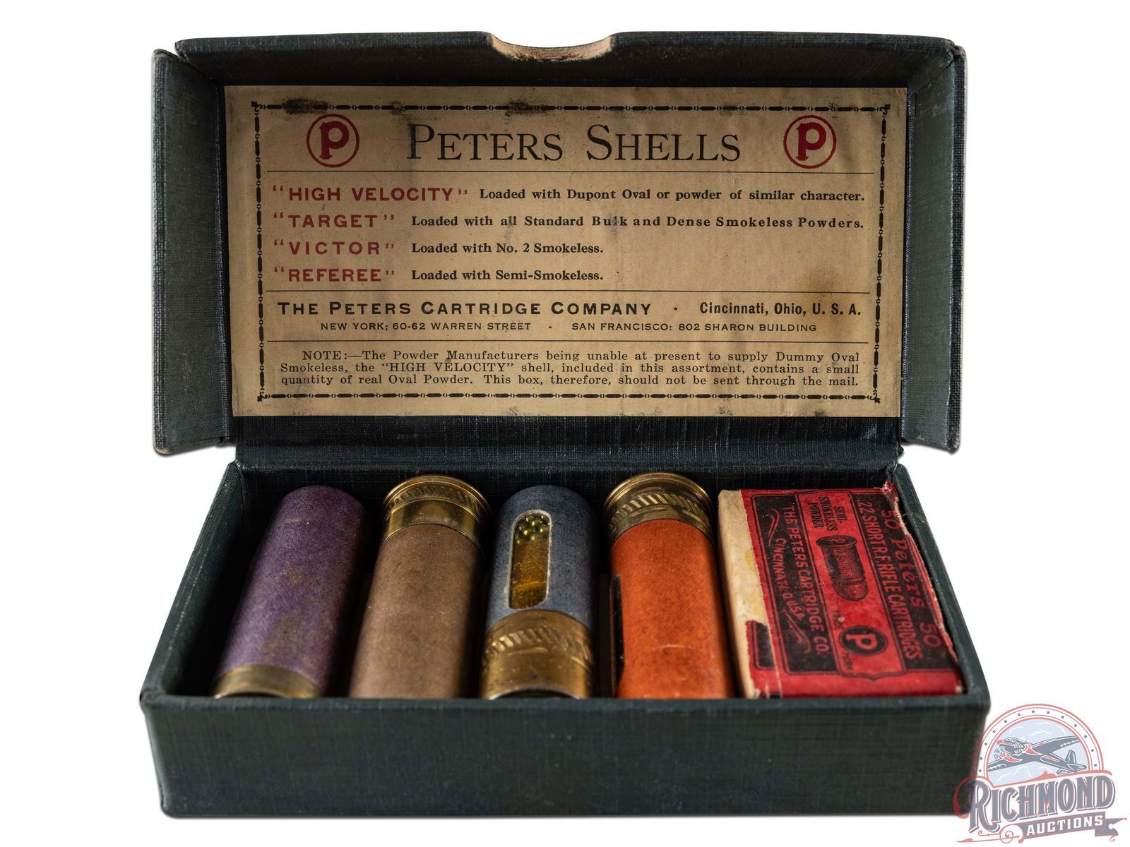 Peters Cartridge Company of Cincinnati, Ohio shotgun shell dummy sample kit with "High Velocity, Target, Victor and Referee" Window shells with 50 round empty Peters 22 short box and label containing warn that real Oval powder was used and shells should not be mailed. Kit is in cardboard green hinged box with gold gilt "P" in circle on lid.