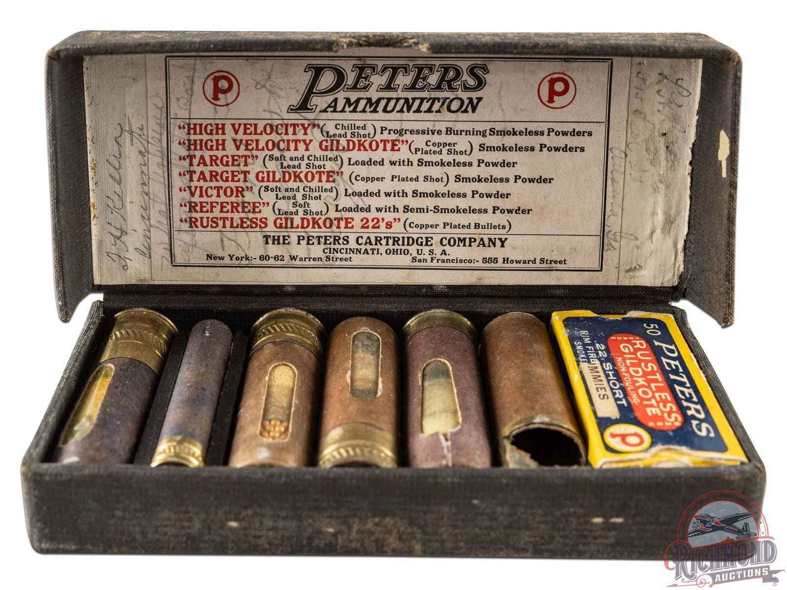 Peters Cartridge Company of Cincinnati, Ohio shotgun shell dummy kit with label listing "High Velocity, High Velocity Gildkote, Target, Target Gildkote, Victor, Referee, Rustless Gildkote 22's". With 410 dummy High Velocity and dummy label 22 box. Kit is housed in black canvas hinged box with faded "P" in circle lid logo.
