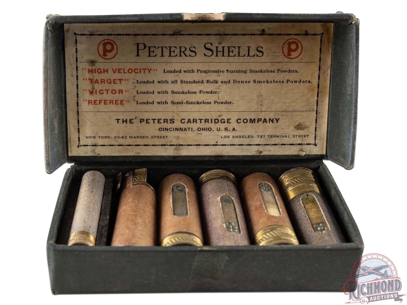 Peters Cartridge Company of Cincinnati, Ohio shotgun shell dummy kit with label listing "High Velocity, Target, Victor and Referee". With 410 dummy High Velocity shell. Kit is in hinged bluish canvas covered cardboard box with faded "P" in circle on lid.