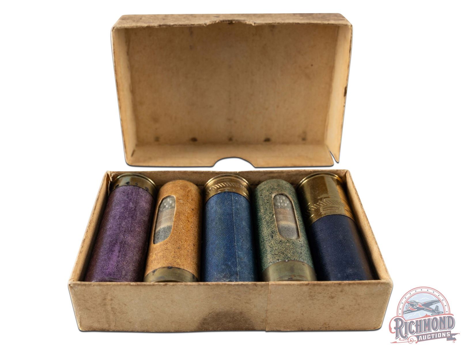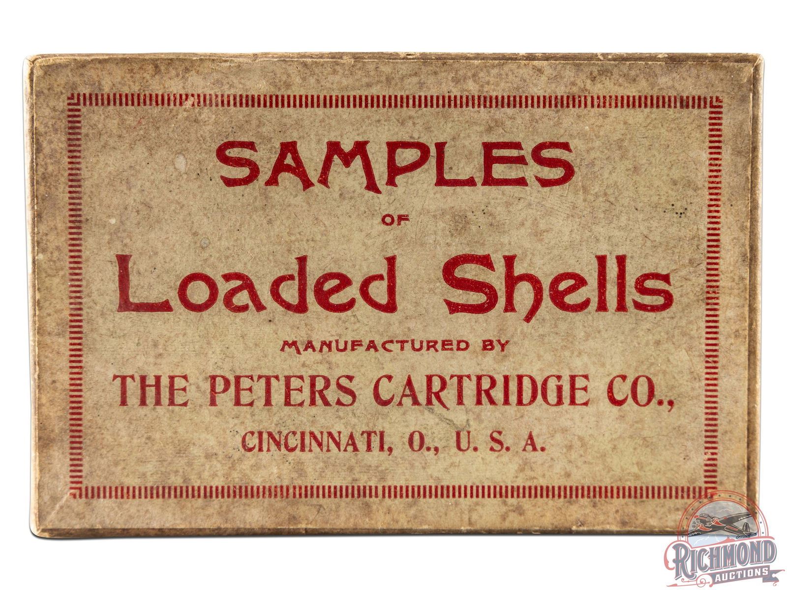 Vintage circa 1910 Peters Cartridge Company of Cincinnati, Ohio Shotshell salesman sample kit featuring "HighGun, New Victor, Premier, League and Referee" headstamp 12 gauge loaded window shells. Kit is housed in tan cardboard two-piece box with red lettering Peters Cincinnati Address.