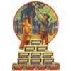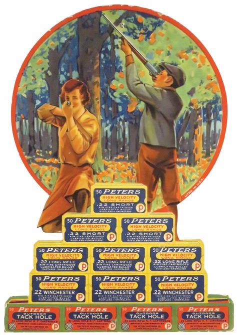 Peters Die Cut Cardboard Easel Back Sign. Depicting pyramid of shell boxes. Edgewear and nail hole at 6:00 otherwise very good condition. 9 3/4 X 13 3/4 inches.