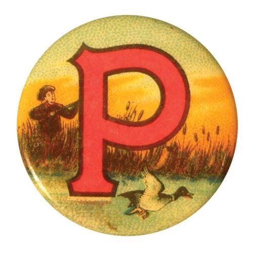 Celluloid Pinback advertising Peters letter P with duck hunter and duck. Excellent condition. 7/8 inch diameter.