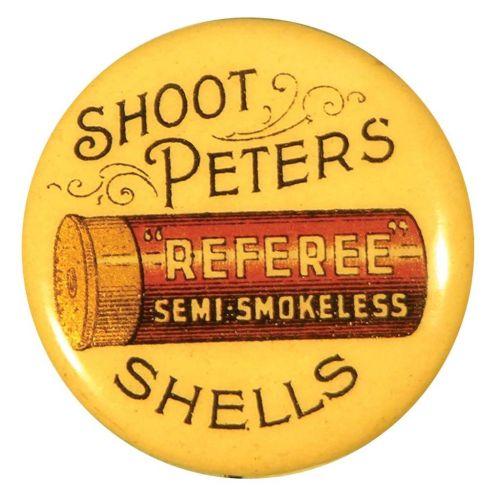 Celluloid Pinback advertising Peters Referee Semi-Smokeless Shells. Excellent condition. 7/8 inch diameter.